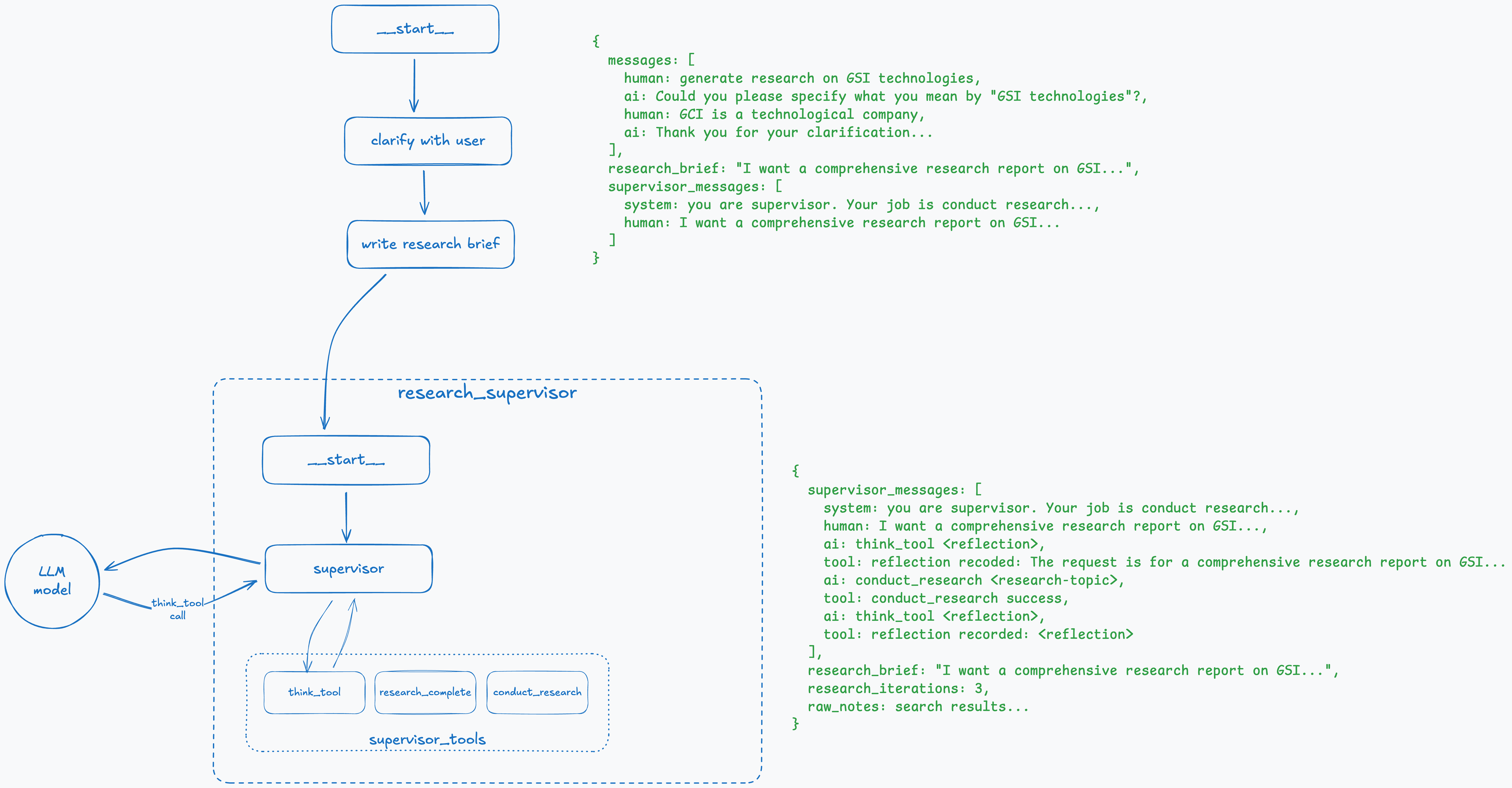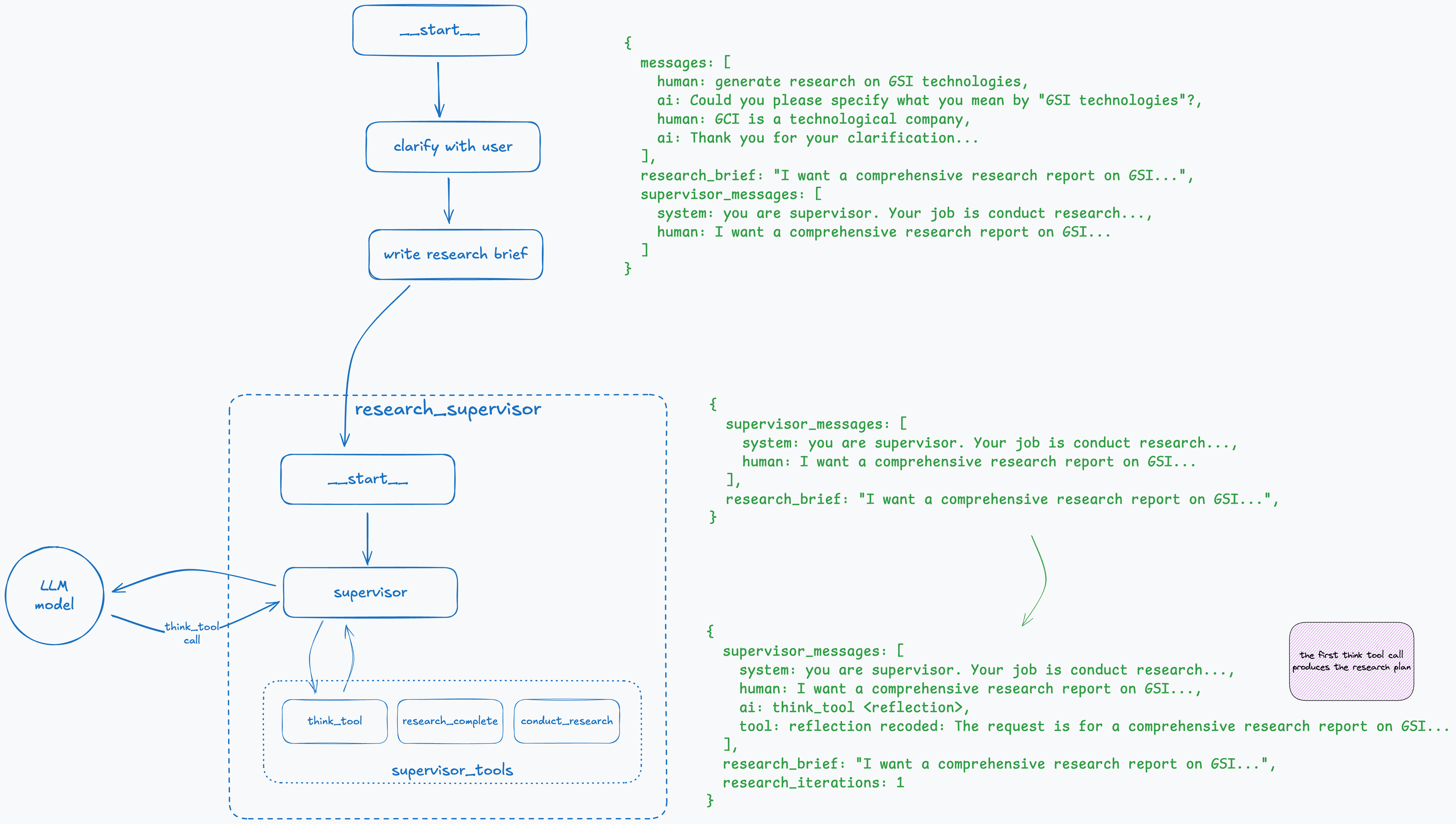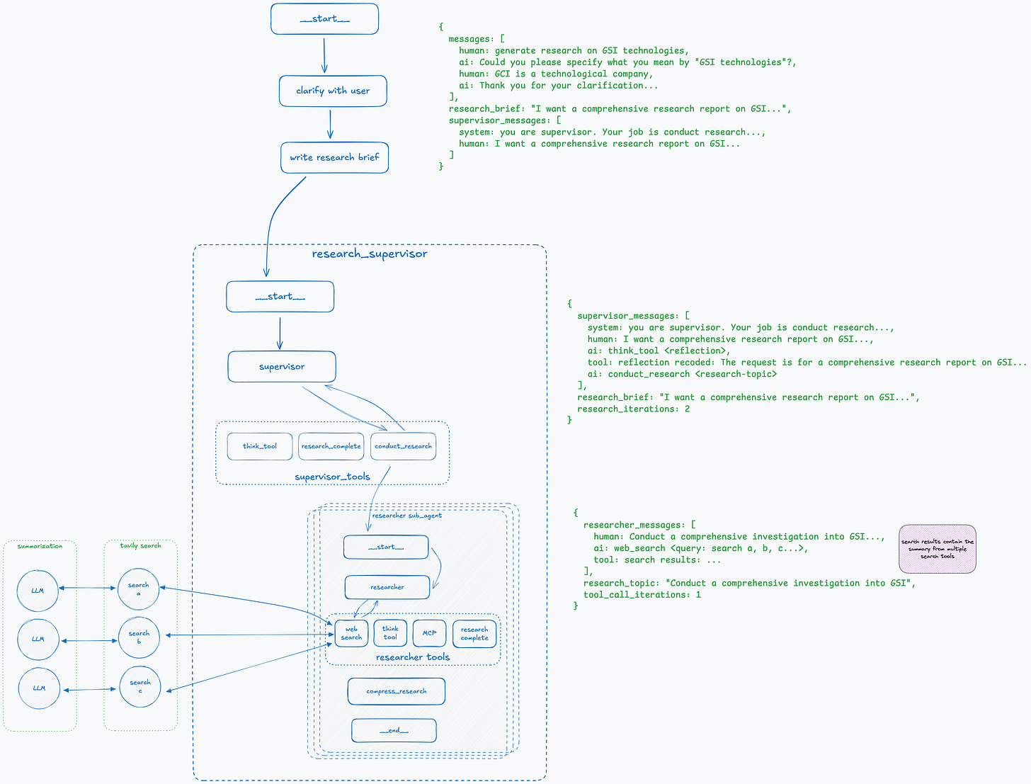 The best way to describe it is to walk through an example step-by-step and see how the overall graph and state of the deep research agent change at each step.
