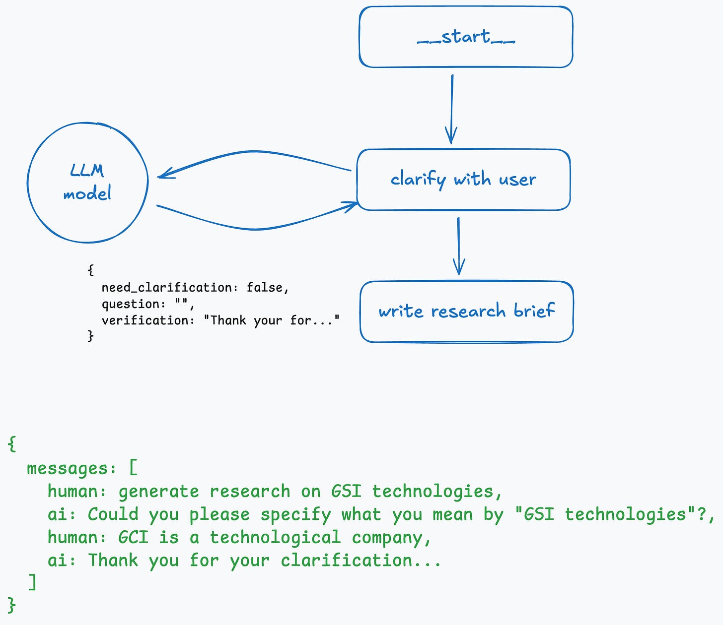 It all starts with the user question. The LLM decides, using structured output, whether it requires any clarification from the user. If so, it returns the corresponding boolean value and a follow-up question that is sent to the user. The state at this stage is simple: an array of messages.